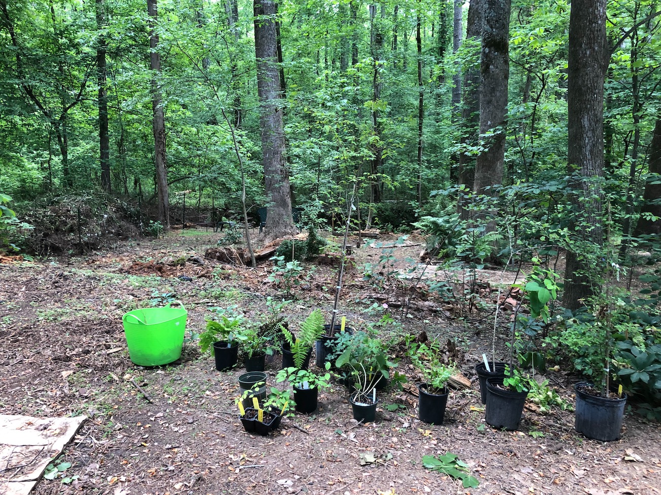 Front yard pollinator meadow is coming into its own. Created a raised bed veg garden also in the front yard. We’ve cleared privet, honeysuckle, and English ivy out and can now get down to the creek and are planting a native woodland. We’re enjoying sitting by the creek and communing with Harold the great blue heron. All the clearing was done by hand including my sweet sons, who’ve been off work,  and Bob the Master Gardener’s Assistant. You’re welcome to come visit. Cheers!