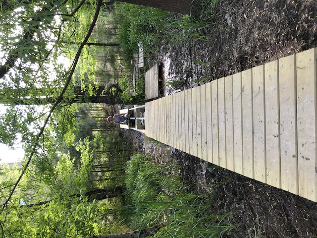 Marcia L told us …. We have a wooded wetland for our back yard. There was an old footbridge across the creek, which had gotten pretty rickety, so we decided to replace it ourselves this year. We are not terribly “handy” (taking the old one apart gave us guidance on how to build the new one), but it kept us busy and outdoors during the entire stay-at-home period!