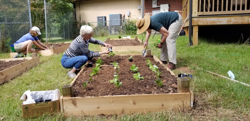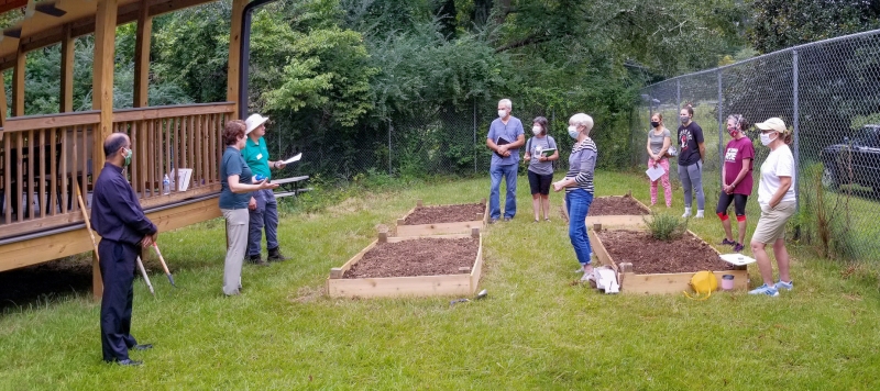 Lettuce, kale, broccoli, cabbage, and peas were planted in raised beds to provide fresh vegetables for the pantry. Twenty-five bags of lettuce have been harvested so far.  A fig tree, blueberry bushes, and a blackberry vine were planted to supply fresh fruit next year. About a dozen people attended each workshop wearing masks and practicing social distancing.