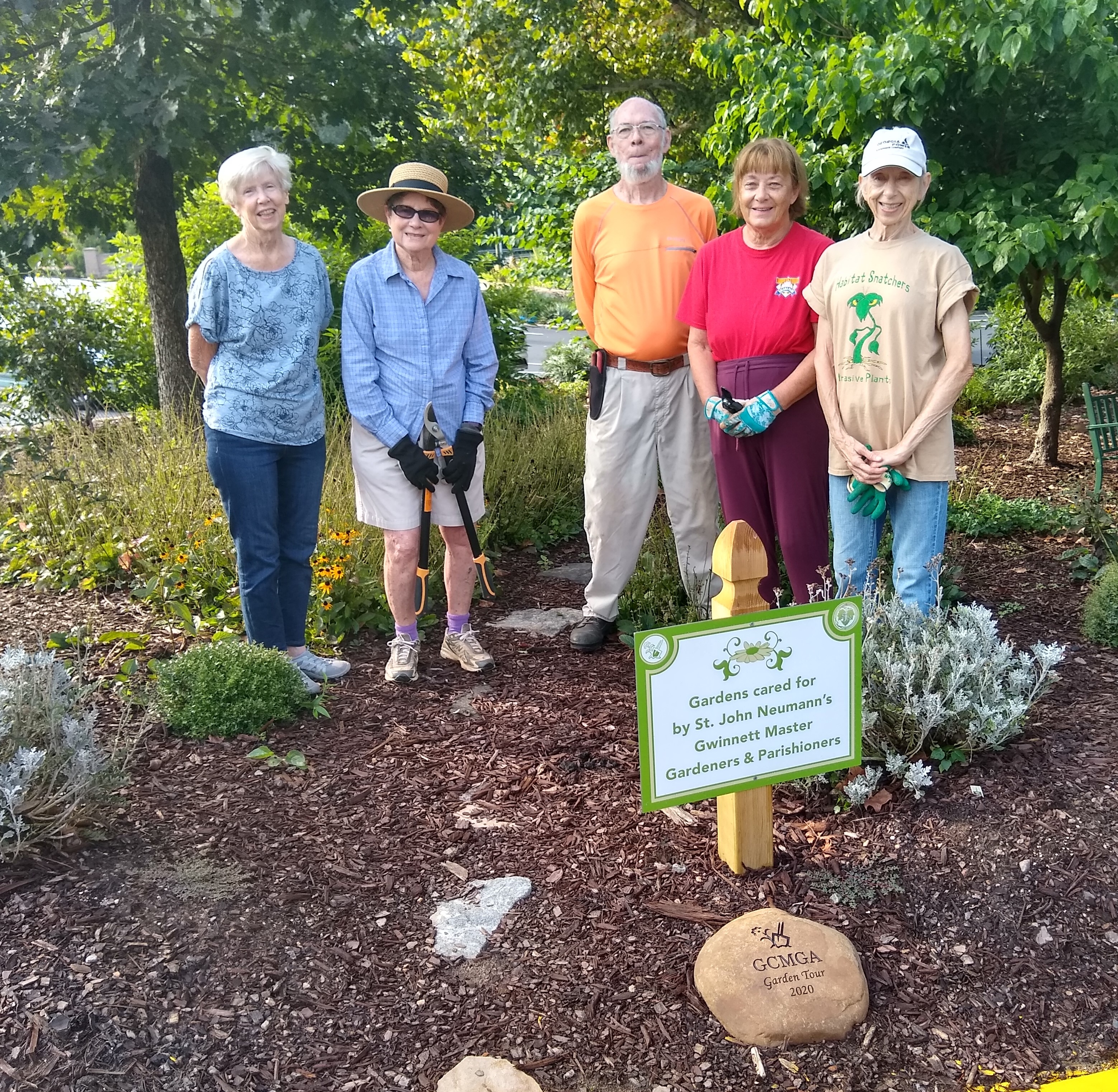 Susan V told us that Master Gardeners, along with a passel of St. John Neumann parishioners, care for creation in the church gardens. Each Thursday, a dozen or so gardeners pull up at 8:30 am to beat the heat to begin work. They unpack hand tools, wheel-borrows and knee pads to pull out weeds, lay down newspaper and cardboard as a barrier against future weeds and pile wood chips on top. They deadhead plants, cull over-crowded plants, water, label horticultural specimens and indulge in a few ripe blueberries. We are following the Action Plan written for Pope Francis’ environmental encyclical Laudato Si in which he calls on the people of the planet to care for the earth and one another. One chapter in the Laudato Si Action Plan recommends using sustainable practices in managing the landscapes surrounding the churches. They include establishing a pollinator garden to attract bees and butterflies whose numbers are down more than thirty percent. Using plants native to the local ecology to draw indigenous wildlife, and foregoing pesticides to avoid harming animals, plants and even humans. Besides benefiting nature, gardening give us the opportunity to socialize with one another and catch up on one another’s news during the pandemic since many of us are staying close to home. Out in the fresh air, we feel invigorated as we exercise and enjoy each other’s company while following Pope Francis call to care for creation and each other.